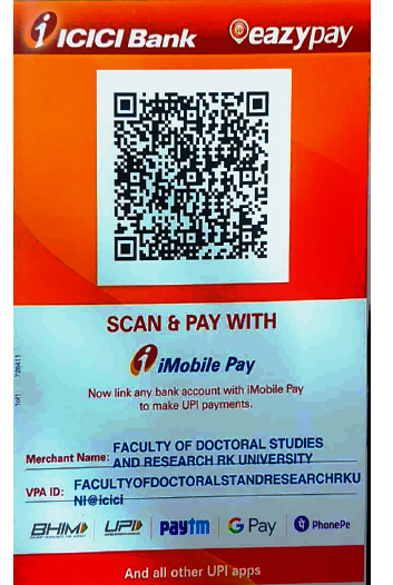 Candidates will be required to download the application form by clicking on the link given below. Application fee is Rs. 2000/- (For Indian Applicant) & Rs. 4000/- (For International/Foreign Applicant). Candidates must send the completed application form along with a ‘Demand Draft’ or ‘Payable at par Cheque’ or ‘online payment proof’ using following QR code [in favor of FACULTY OF DOCTORAL STUDIES & RESEARCH RK University] to the address given below